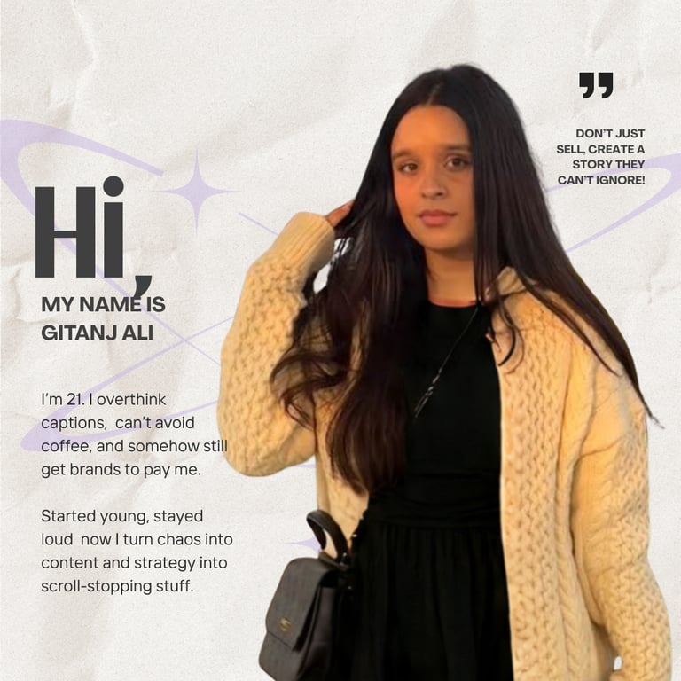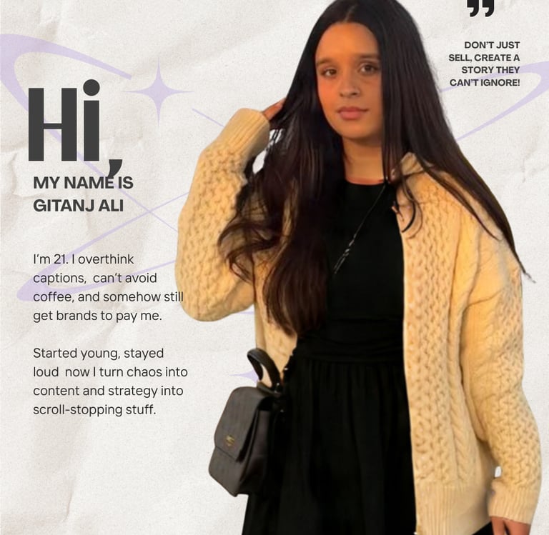 Hi, this is Gitanjali a 21-year-old full-time freelancer with 3+ years of hands-on experience in social media marketing. I help brands grow online with content that feels real and delivers actual results.